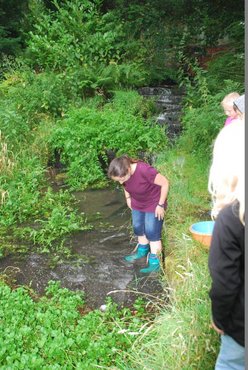 Bei einem super Wetter machten sich etwa 20 Mettinger Bachforscher auf den Weg um in den unerforschten Tiefen des Mühlenteichs die Wasserwelt zu erforschen. Was wird es da alles zu sehen geben? Ausgerüstet mit - meist zu kurzen - Gummistiefeln wurden riesen Fische mit dem Küchensieb an Land gezogen und Köcherfliegenlarven bestaunt. Einige Forscher gingen so engagiert an die Arbeit, dass sie die Wechselwäsche benötigten.