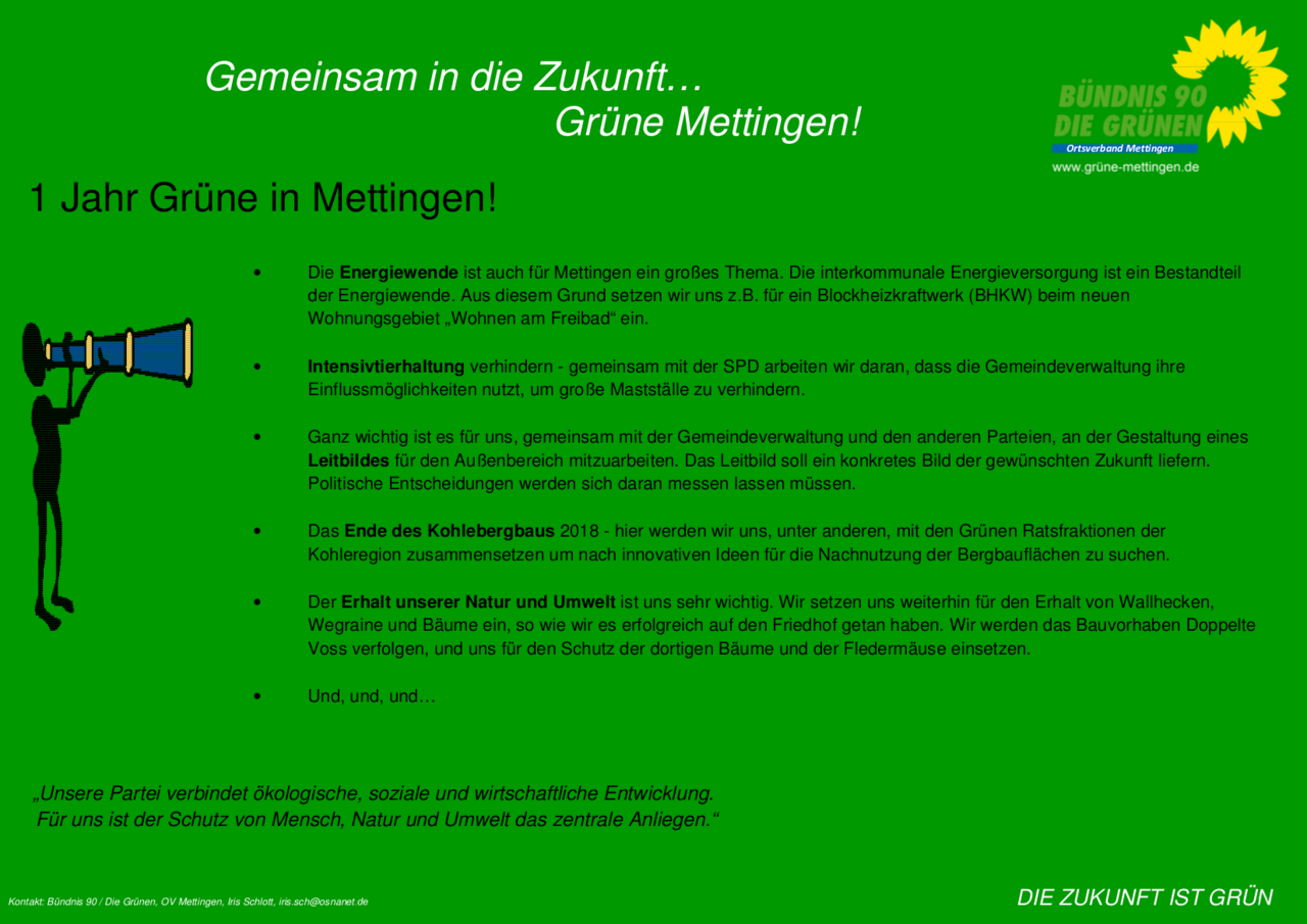 Mit Ihrer Hilfe haben wir es geschafftt. In Mettingen gibt es nun eine Grüne Ratsfraktion. Am 25. Mai haben 7,1 Prozent der Mettinger ihr Kreuz an der der "richtigen" Stelle gemacht.